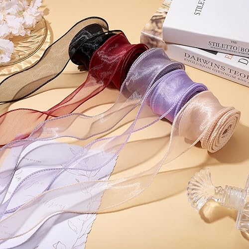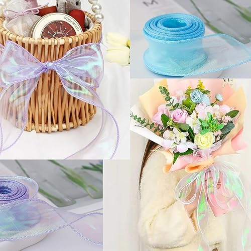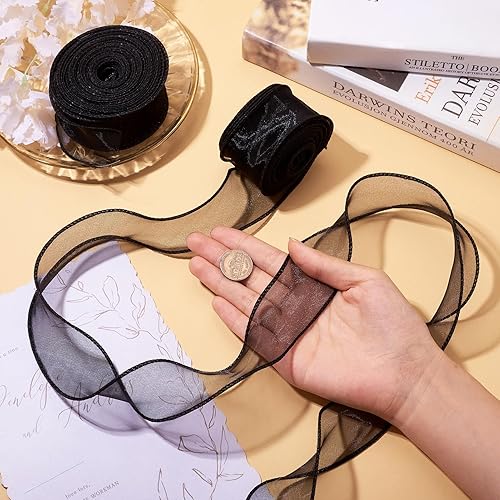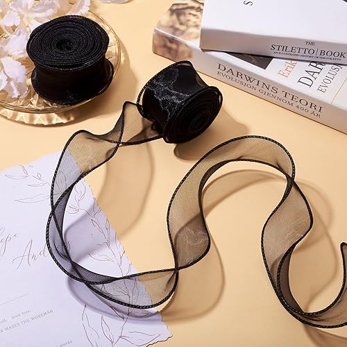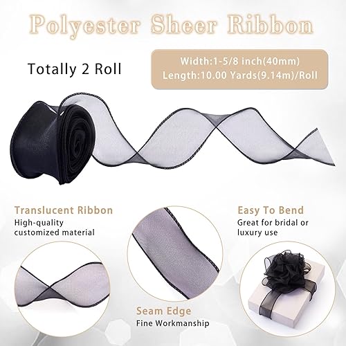 Crafans Lot de 2 rouleaux de ruban irisé noir scintillant en polyester transparent en forme de queue de poisson, ruban en mousseline de soie organza pour nœud floral, emballage cadeau