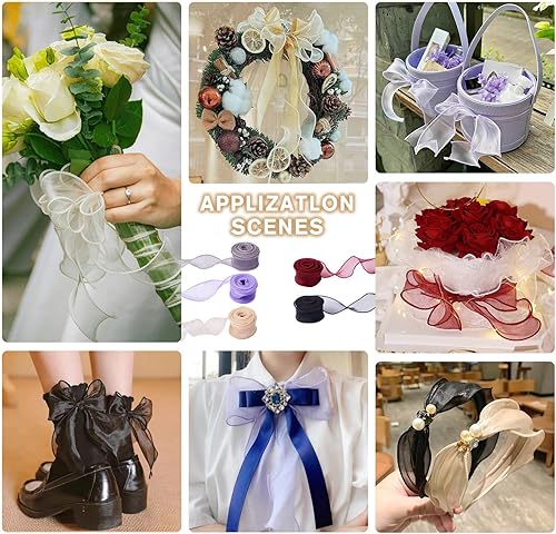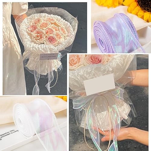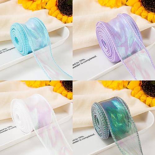 FLEXNOVA Lot de 4 rouleaux de ruban en organza scintillant - 40 mm x 9 m - Blanc bleu vert violet - Ruban cadeau large - Ruban de satin - Ruban en mousseline de soie - Ruban de mariage pour bouquet de