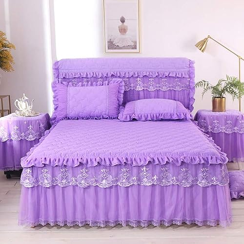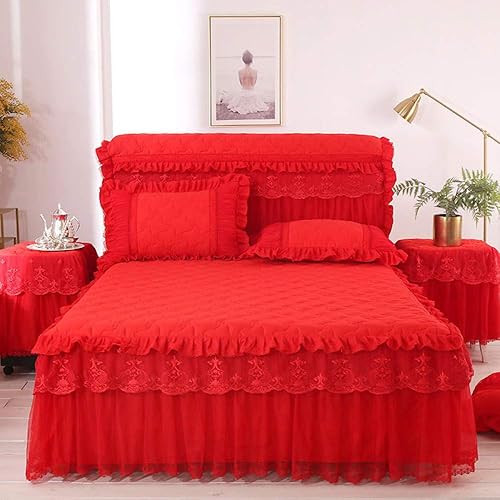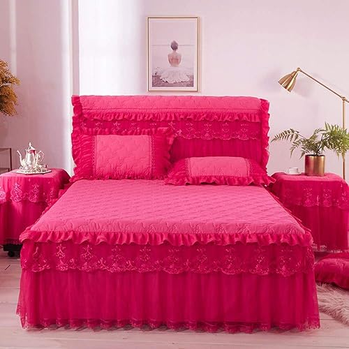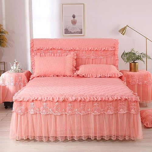 Couvre-lit Jupes De Lit, 3 Pièces Dentelle Jupe Dessus De-lit Draps Avec Jupe De Lit à Volants Anti-poussière Princesse/Anti-Rides/antidérapante,RosePink-200x220cm