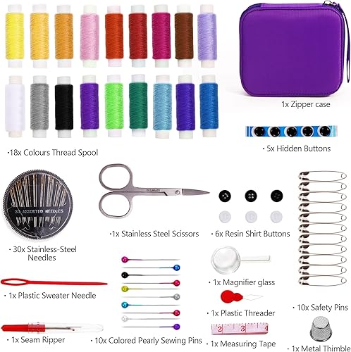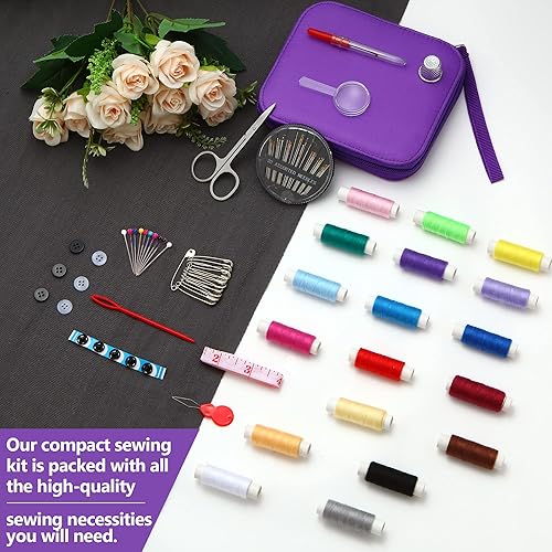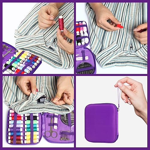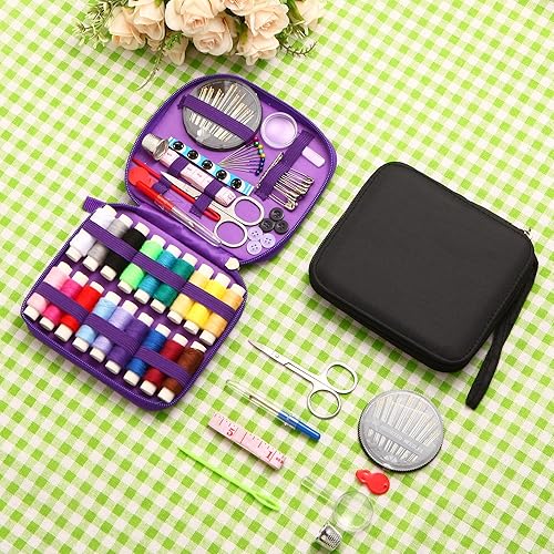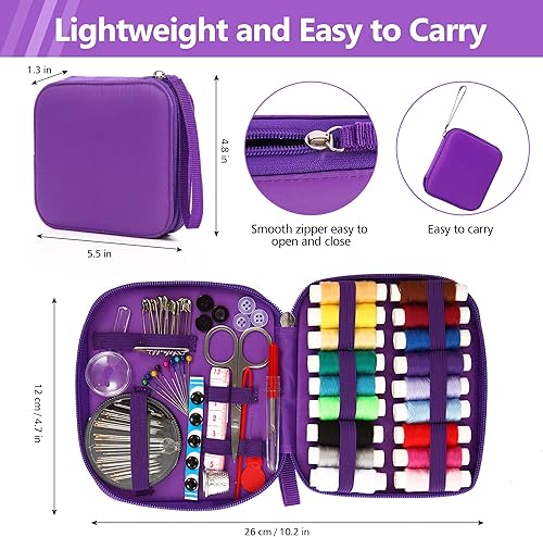 AUERVO Kit de couture 86 pièces avec fils et aiguilles pour adultes, bricolage, maison, voyage et urgence avec petit étui compact violet à fermeture éclair
