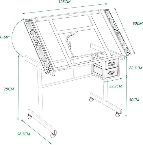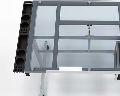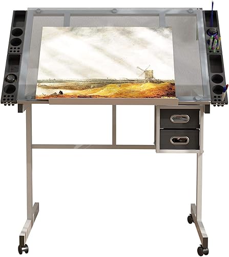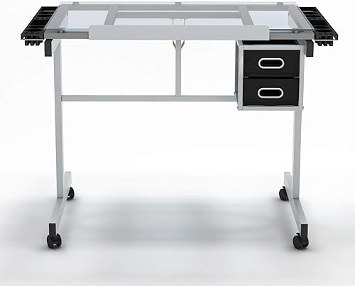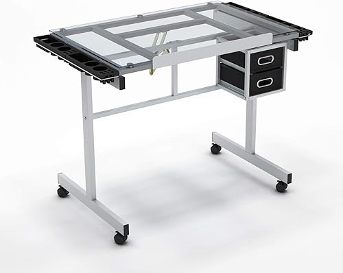 SogesHome Table à Dessin,Hauteur Réglable,avec 2 Tiroirs,pour Beaux-Arts, Cours de Travail, Les Architectes, Ingénierie,104 x 60 x 78,5 cm, Verre Transparent,SH-UT-DT1033-WT