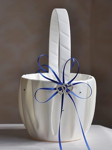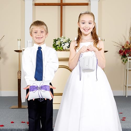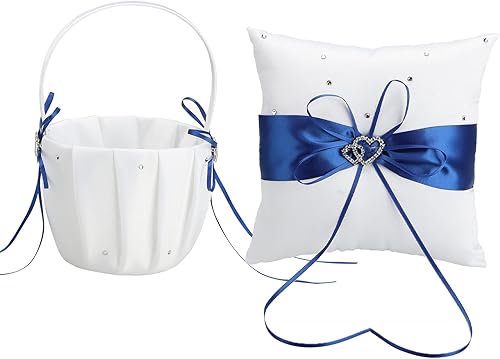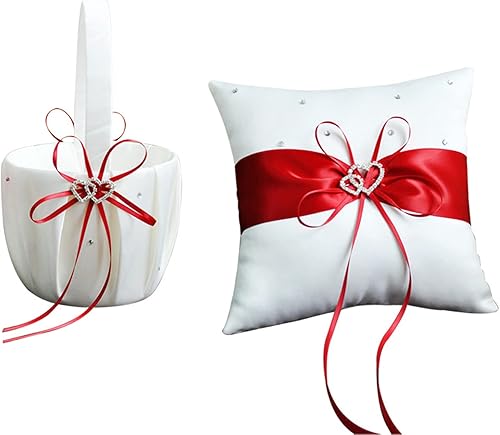 Lot de 2 Paniers de Mariage pour Fille de Fleur et Oreiller Porteur D'anneaux, Panier de Mariage en Satin Blanc avec Strass Double Cœur et Ensemble D'oreillers pour Alliances, Panier de(Rouge)