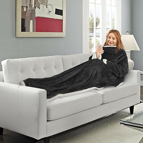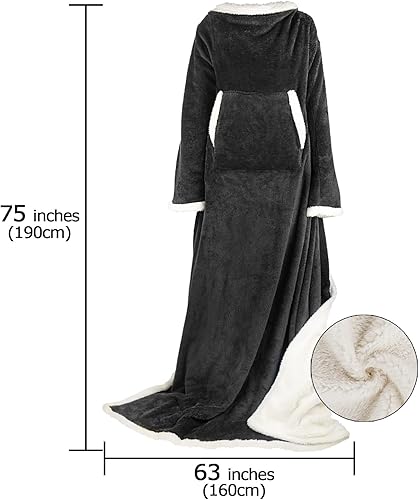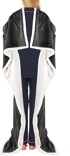 Linkidea Couverture portable Sherpa avec manches et poches pour adultes, femmes et hommes, peignoir en polaire pelucheuse pour canapé, canapé (gris), gris, plein