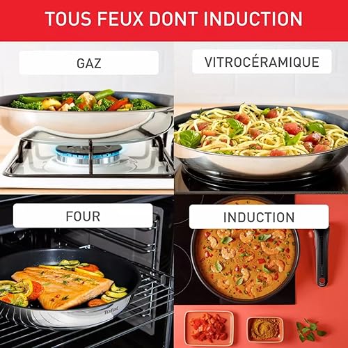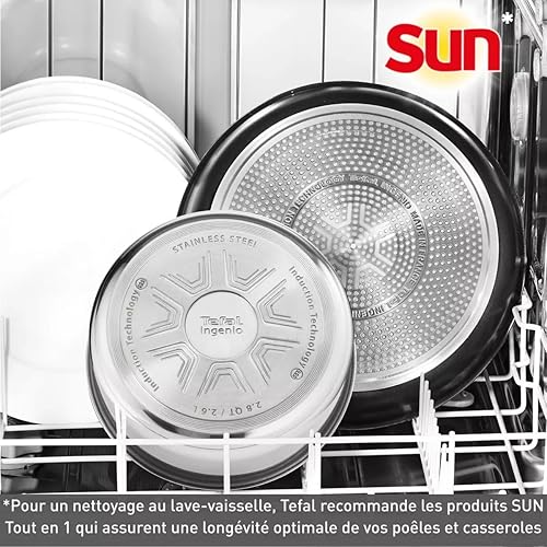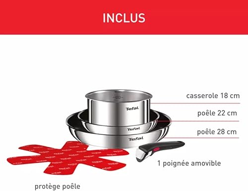 TEFAL Set de 5 pièces TEFAL INGENIO composé de 2 poêles (22 et 28 cm) en inox revêtu, 1 casserole 18 cm en inox non revêtu, 1 poignée amovible et 1 feutrine. Tous feux dont induction