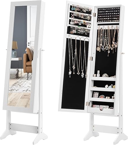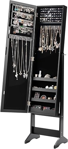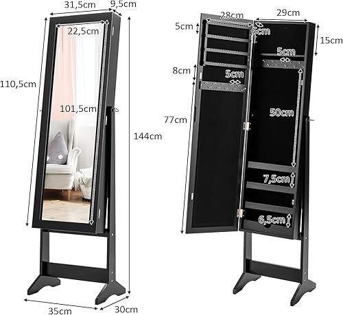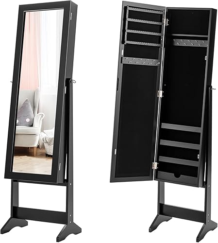 DREAMADE Armoire à Bijoux en MDF avec Grand Miroir en Verre, 3 Angles d’Inclinaison Réglables, Rangement pour Anneaux, Boucle d'oreille, Bracelet, Colliers (Noir)