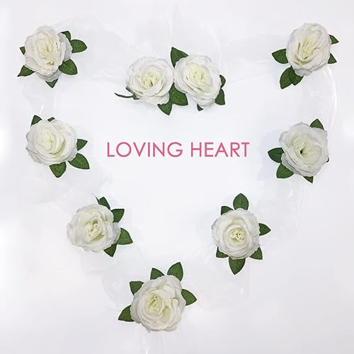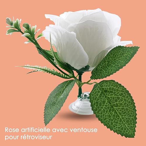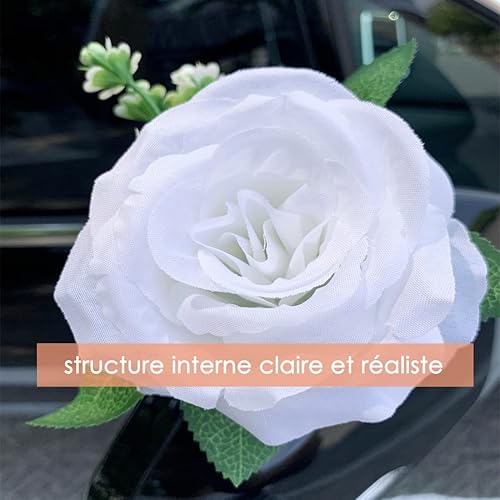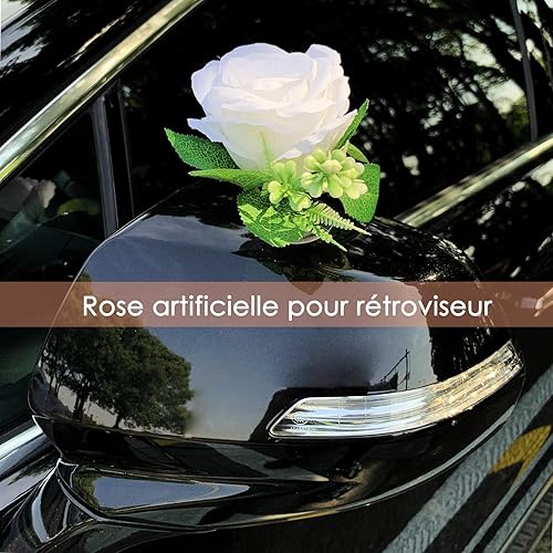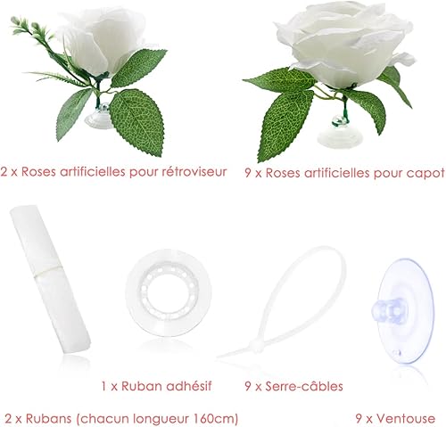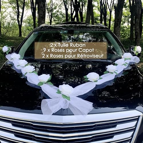 Kit Deco Voiture Mariage Décoration Champêtre avec 2 Pcs Tulle Ruban Blanc, 11 Pcs Rose Artificielle, Ventouse - Blanc