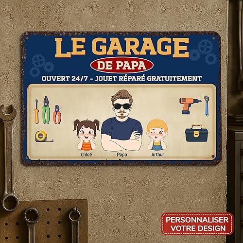 Cadeau Plus Plaque Métal Personnalisée - Le Garage De Papa Bricoleur - Plaque metal vintage, fete des peres cadre, deco garage vintage, cadeau fete des peres plaque garage (3 Enfants)