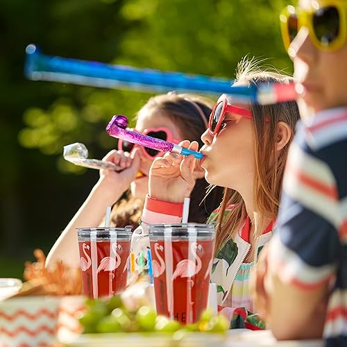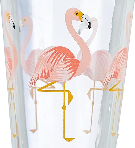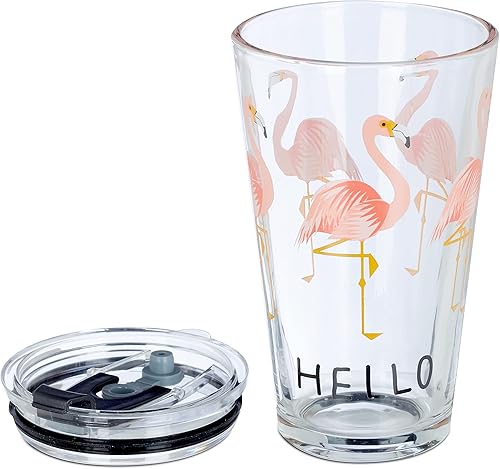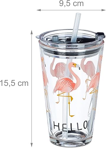 relaxdays Verre avec Paille et Couvercle, Lot de 4, Motif Flamant Rose, 450 ML, lavables au Lave-Vaisselle, Transparent