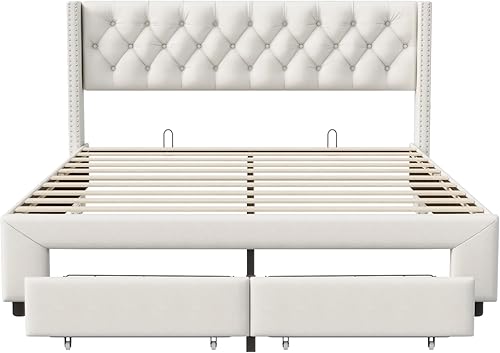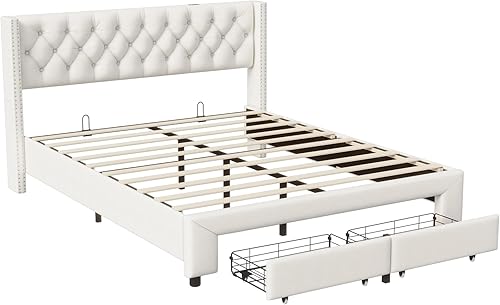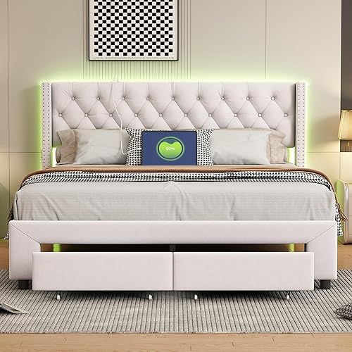 Lit Double 160x200 avec Sommier LED et USB,Lit rembourré avec sommier à Lattes et 2 Tiroirs de Rangement, Lit 2 Personnes pour Adultes et Adolescents (Beige, 160 x 200 cm)