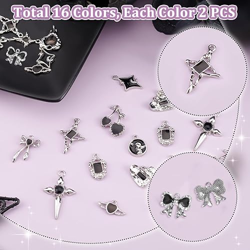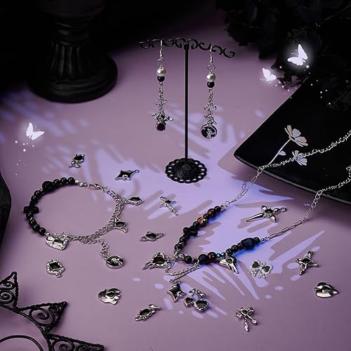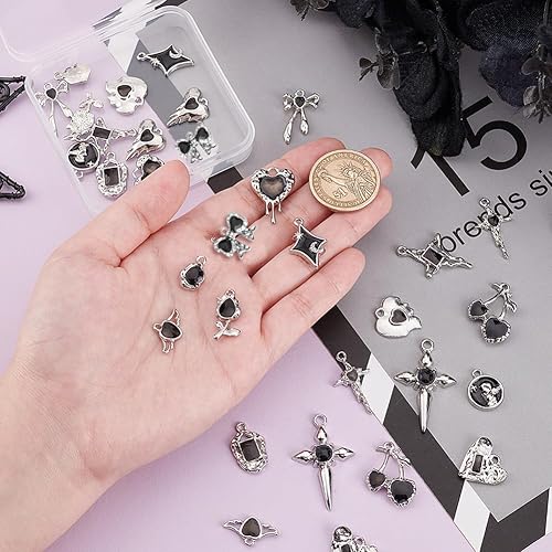 PH PandaHall 32pcs 16 styles Pendentifs à Breloques Gothiques en Émail, Breloques Noires Suspendues en Forme de Cœur en Alliage Gothique Pendentif Bracelet Breloques en Vrac pour Bijoux