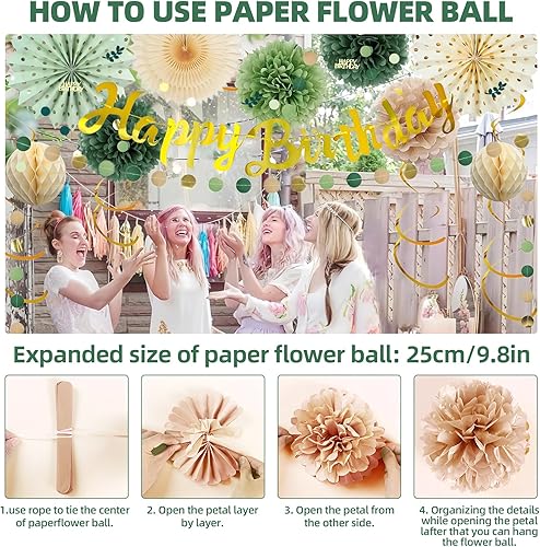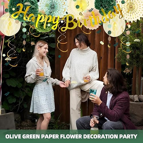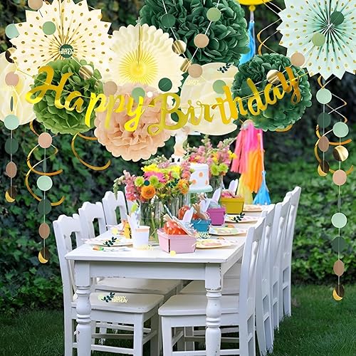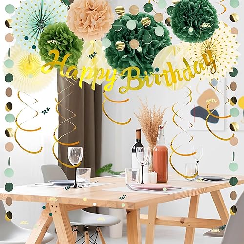 Décoration de fête réutilisable, guirlande Happy Birthday, décoration de gâteau, pompons, lanternes en papier, boules en nid d'abeille, confettis, décoration d'anniversaire vert doré, vert sauge