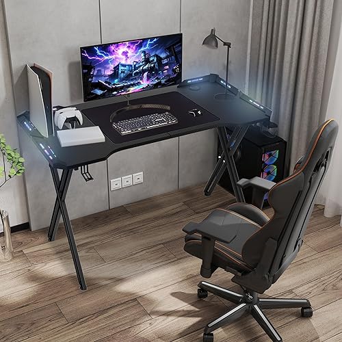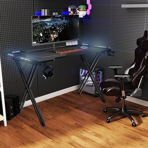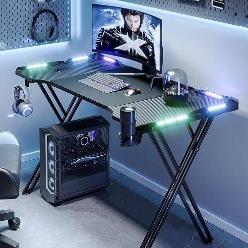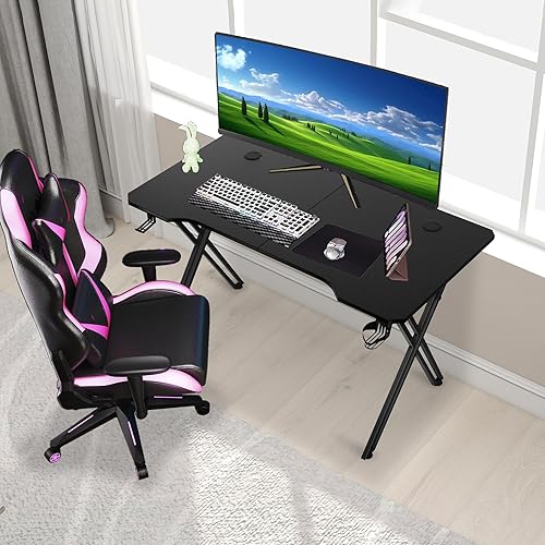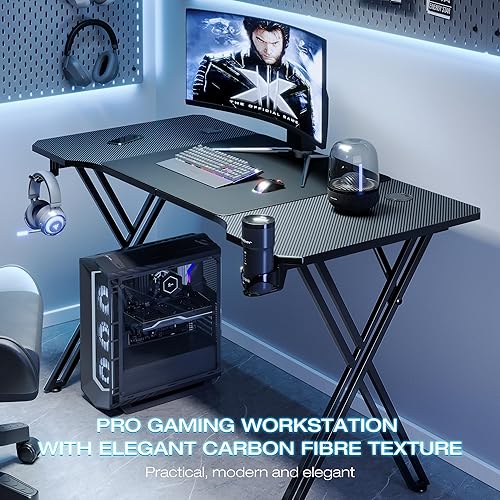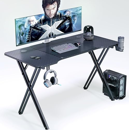 XMTECH Bureau Gaming 120x60 - Table Gaming Cadre en X avec Surface en Fibre de Carbone Stable - avec Porte-gobelet et Crochet pour Casque - Noir