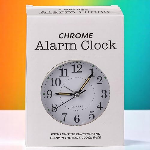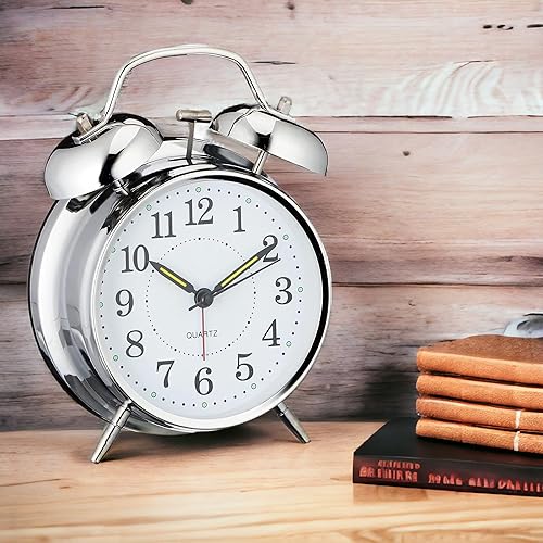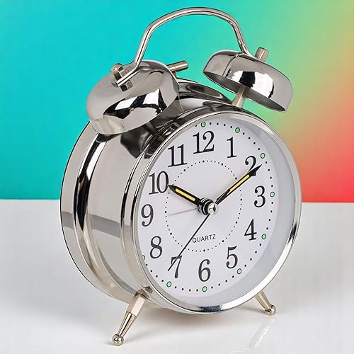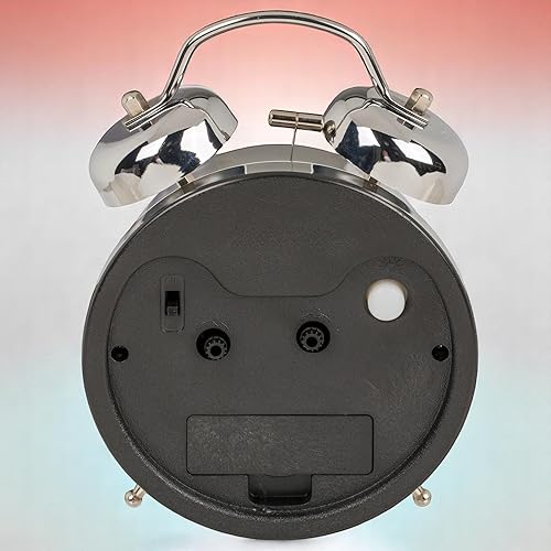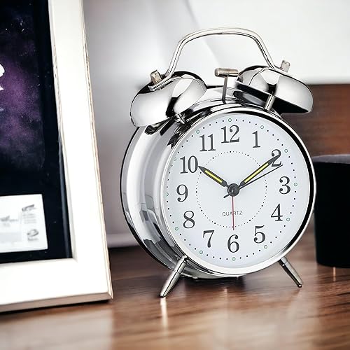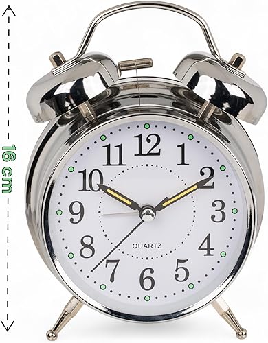 MIJOMA Réveil analogique rétro en métal chromé Ø 10 x 16 cm - Horloge de table avec double cloches, veilleuse, mouvement à quartz - Réveil vintage à piles