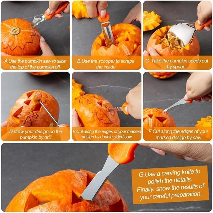 Kit de sculpture de citrouille d'Halloween, 7 pièces en acier inoxydable, kit de sculpture de citrouille, décoration DIY avec sac de transport, bricolage citrouille, décoration d'Halloween