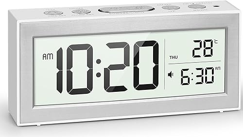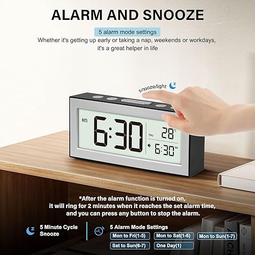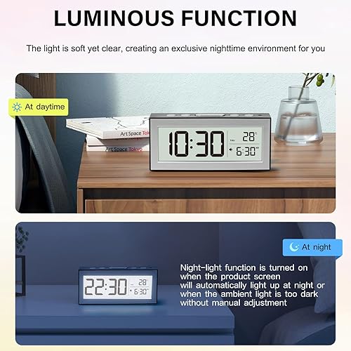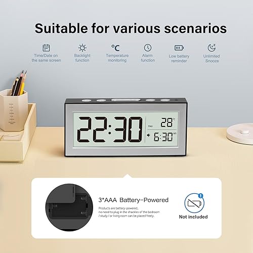 YouJabz Réveil numérique avec grand écran LED, réveil de chevet à piles avec veilleuse, 5 horaires d'alarme, réglage automatique de la luminosité, répétition, calendrier, 12/24h, °F/°C