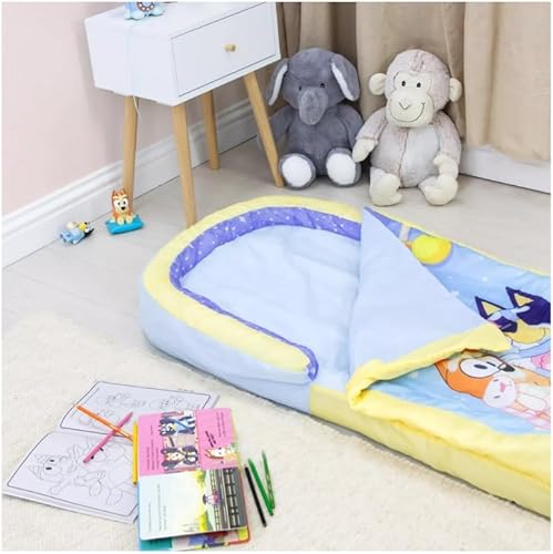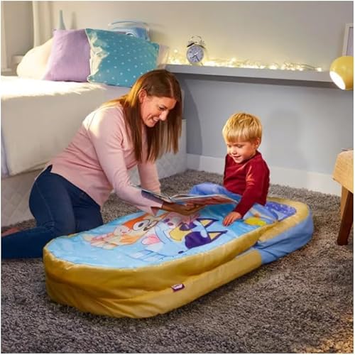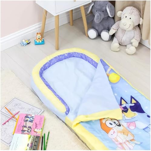 Character World Bluey ReadyBed Lit d'Appoint Enfant Gonflable 2-en-1 avec Couette Intégrée, Matelas Camping et Soirée Pyjama, Pompe et Sac de Transport Inclus, Lavable en Machine, 130x61x23 cm