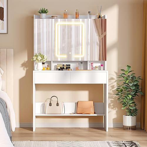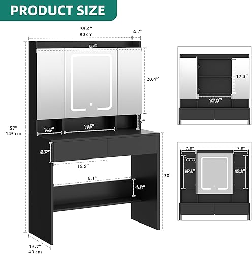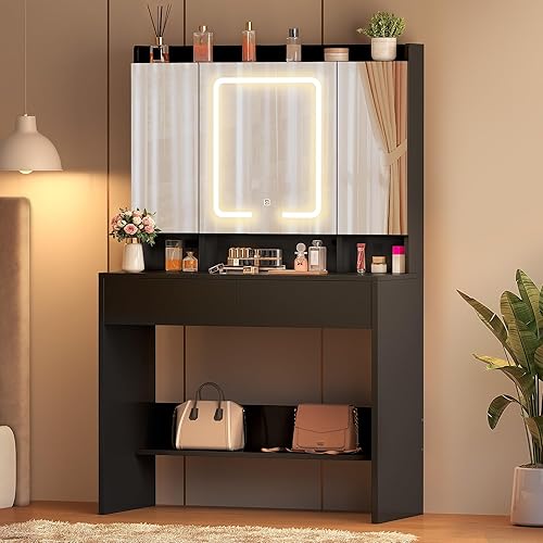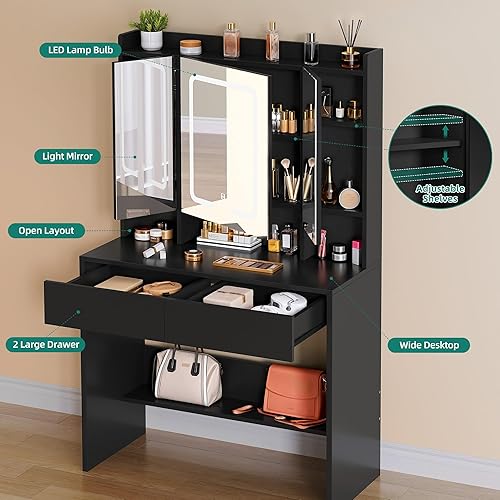 YITAHOME Coiffeuse avec Miroir LED à Luminosité Réglable, Table de Maquillage avec Miroir, Coiffeuse avec étagères et 2 Tiroirset 5 Étagères de Rangement pour Chambre à Coucher (Noir)