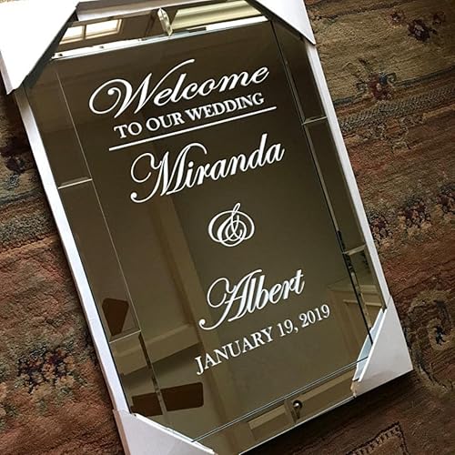 Mariage Bienvenue Miroir Vinyle Autocollant Conception Simple Noms Personnalisés Autocollant Signe De Mariage Miroir Décor Art De Mariage Personnalisé AZ657-H626 État Gris, 38x57cm