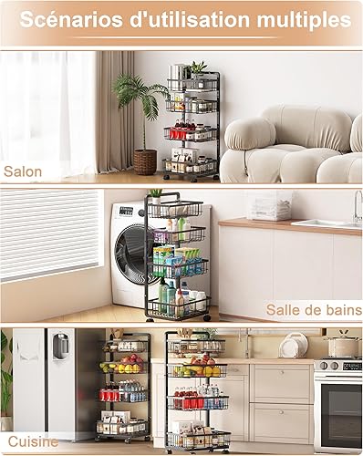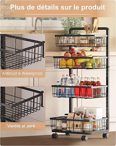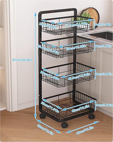 UMDONX Chariot de Cuisine Métallique 4 étages, Desserte de Service à roulettes, Panier de Fruits et Légumes pour Cuisine Chambre Salon Bain, Noir 42 x 32 x 87 CM