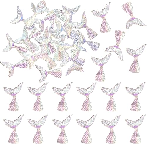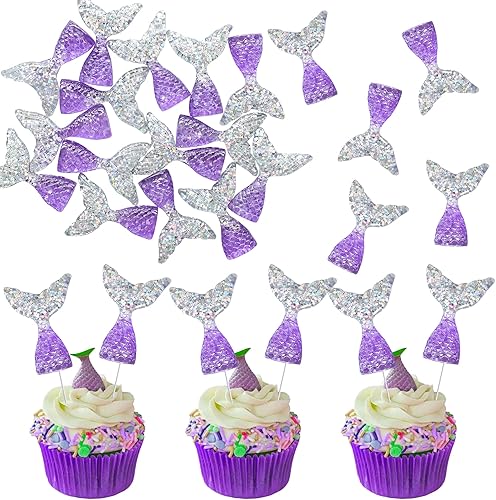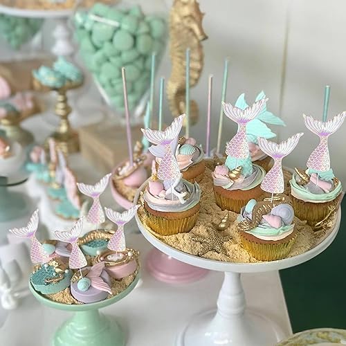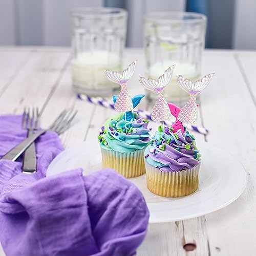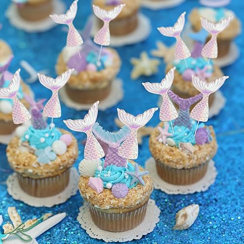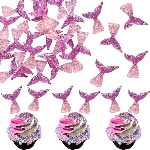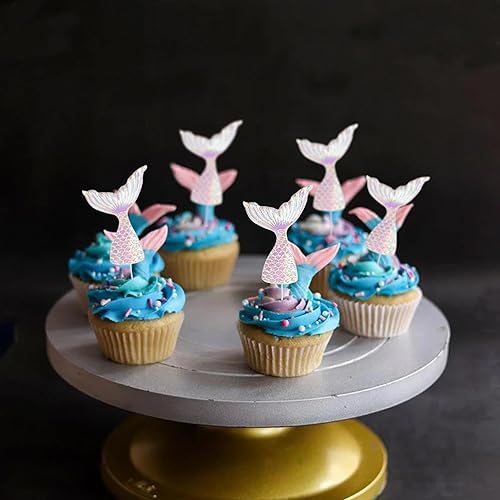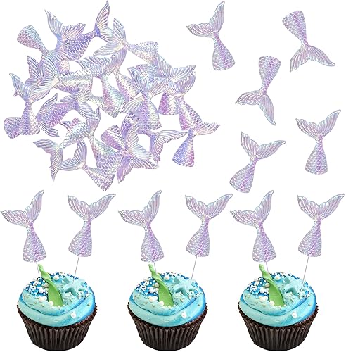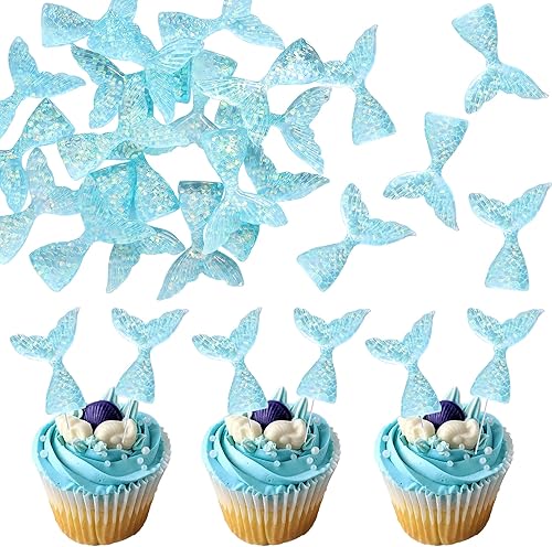 Ephlyn Lot de 24 figurines queue de sirène en acrylique – Décorations de cupcakes, mini emballages et décorations de gâteaux pour fête sirène et fête prénatale – Bleu et rose
