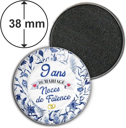 Badgmania Magnet Aimant | Anniversaire 9 Ans de Mariage Noces de Faïence | 3.8cm | Anneaux Mariage
