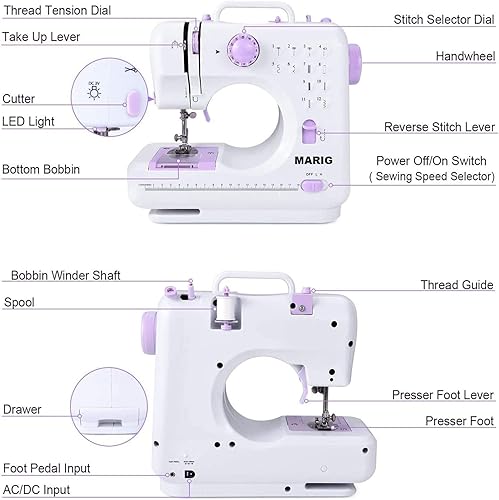 Machine à coudre pour débutants, manuel en 5 langues, accessoires 52PCS, 12 points 2 vitesses à double fil.MARIG FHSM-505