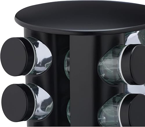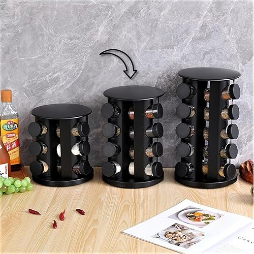 EliteHoff Carrousel à épices, Étagère à épices rotative en acier inoxydable, Tourniquet à épices ronde, Ensemble de pots à épices noir (16 pots)