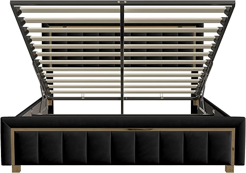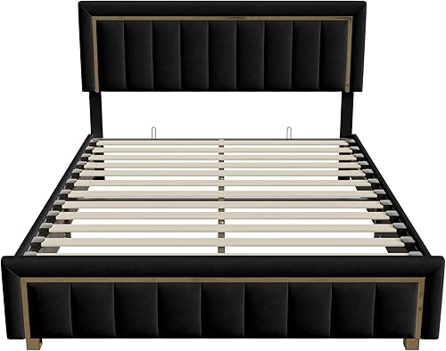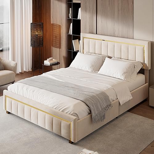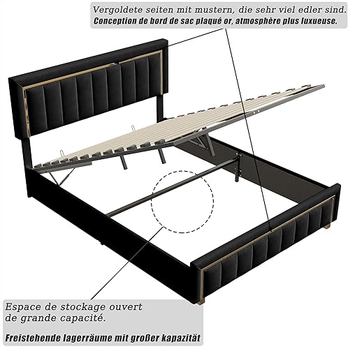 Générique Lit 140 x 200 cm, avec Tête de lit et Coffre Hydraulique, Double à Lattes pour 2 Personnes, Rembourré avec Cadre, Garniture dorée, sans Matelas (Beige, 140x200cm)