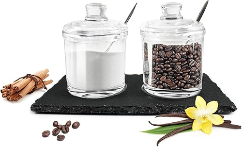 Lot de 2 pots à épices sur plateau en ardoise avec cuillère pour confiture, miel, sucre, sel, parmesan.