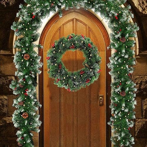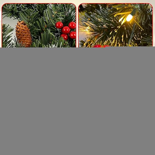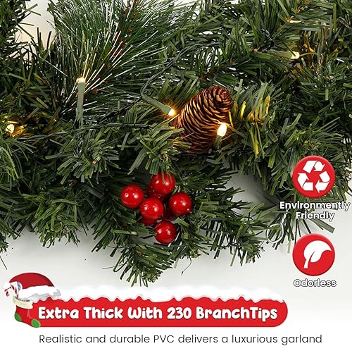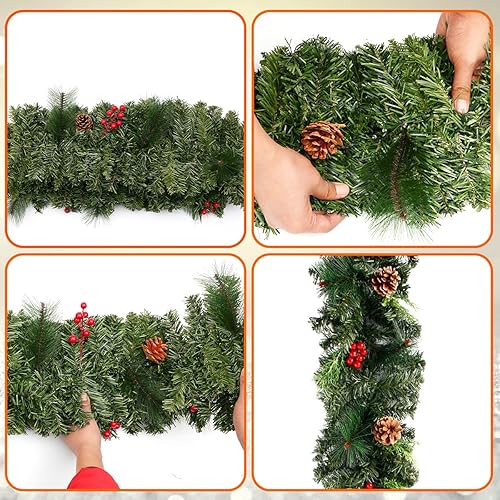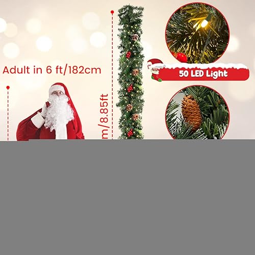 Ghopy 270cm Guirlande Sapin Noel Artificiel, Couronne Sapin Vert Arbre avec Pommes de Pin, Fruits Rouges, Décoration Idéale Noël, pour Chambre Porte Mur Fenêtre Escalier Cheminée (2,7m avec 50Leds)