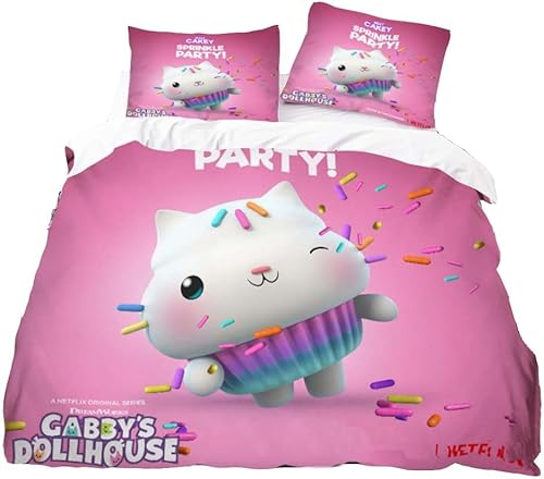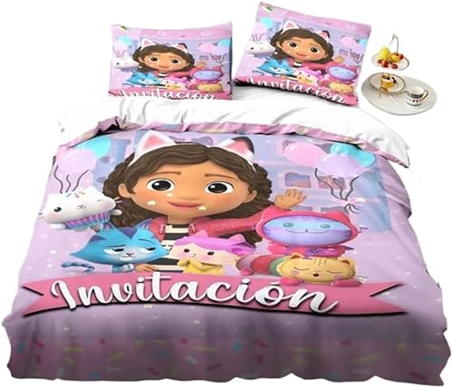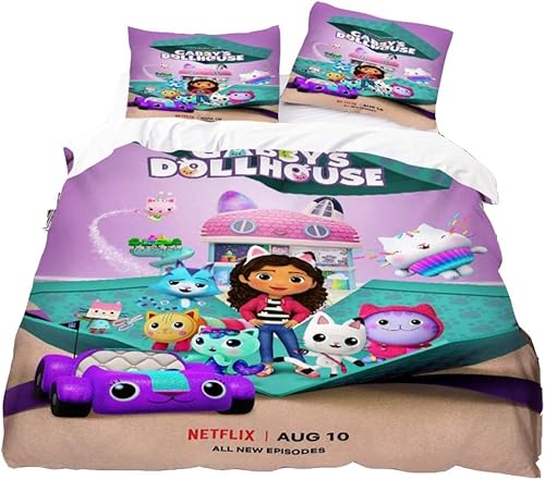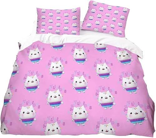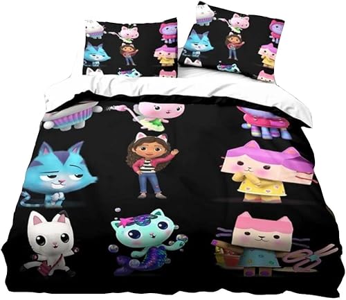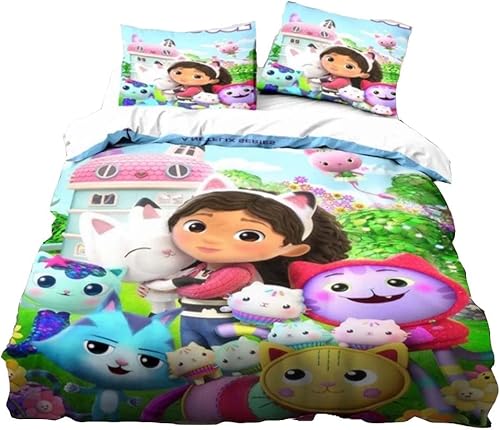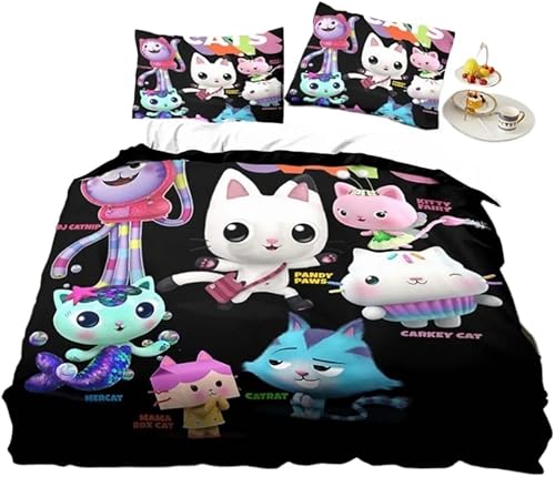 HQMOMO Gabby's Dollhouse Parure de lit pour enfant douce et mignonne 3D dessin animé Cat 100 % microfibre, lit simple, double, décoration d'intérieur pour filles et enfants, (155 x 220 + 80 x 80 cm x