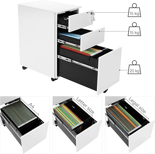 SONGMICS Caisson de Bureau, Lot de 2, Placard de Rangement Mobile, avec roulettes et Serrure, pour Documents et Dossier Suspendu, avec 3 Tiroirs, Blanc OFC031W01