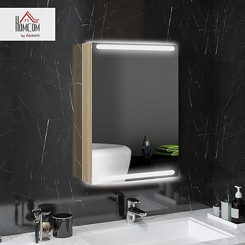 HOMCOM Armoire Murale, Meuble Salle de Bain avec Miroir, Armoire Suspendue avec éclairage LED et étagères en Verre réglables, 50 x 12,5 x 70 cm, Finition Bois Naturel
