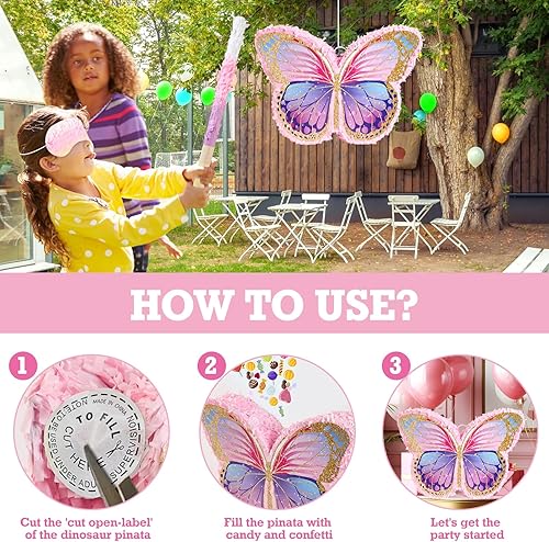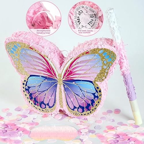 Pinata papillon - Accessoire de fête - Avec bandeau pour les yeux et chauve-souris - Pour filles et enfants - Décoration d'anniversaire - Jeu d'activités de carnaval