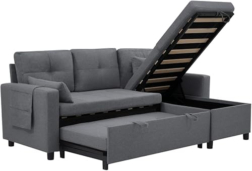 Seyakany Canapé d'angle Convertible avec équipé d'un Espace de Rangement et d'un Porte-gobelet Rabattable,canapé Convertible 3 Places Moderne en Forme de L,canapé lit gigogne,Lin (Gris)