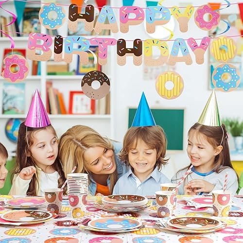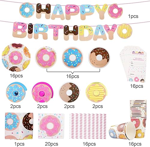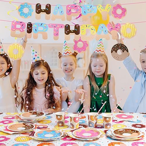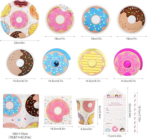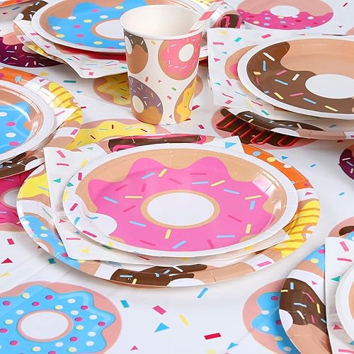 Gtuzkheu 110pcs Set de Vaisselle Beignet, 16 invités Décorations Anniversaires Tasse Papier Nappe Serviette Assiette Paille pour Enfants Party Fête Filles Noël Baby Shower Mariages