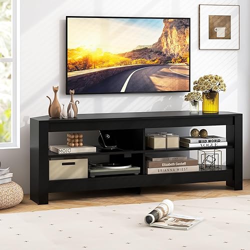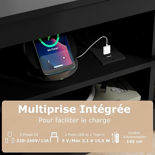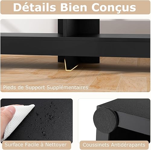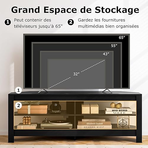 COSTWAY Meuble TV Angle, Meuble Télé avec Prise, 2 Prises, 2 USB, 1 Type-C, Petit Meuble TV pour 65', Meuble TV Bois 3 Niveaux, 4 Etagères Ouvertes (Noir)
