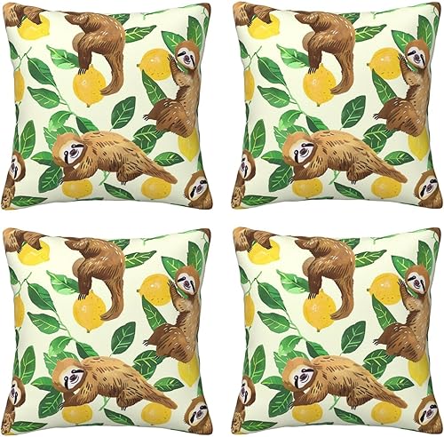 AUBKFELD Lot de 4 housses de coussin imprimées de paresseux mignons sur des citrons jaunes (40 x 40 cm) - Taies d'oreiller décoratives pour la maison - Fermeture éclair dissimulée
