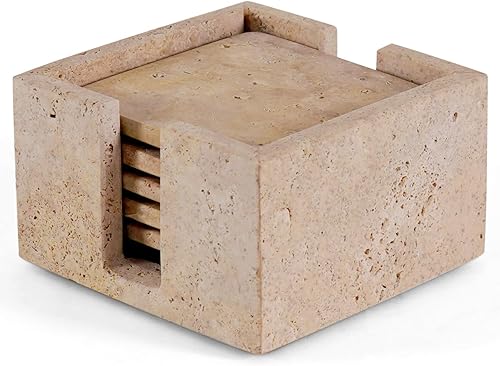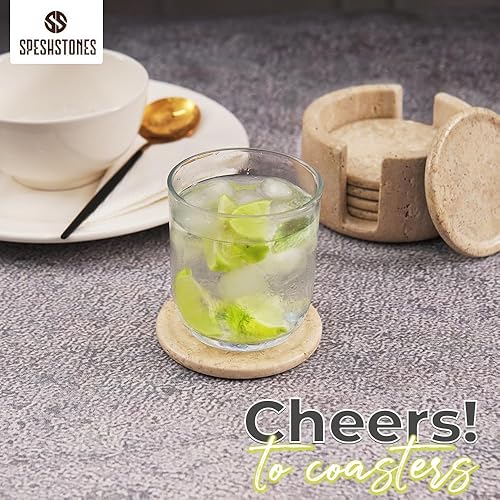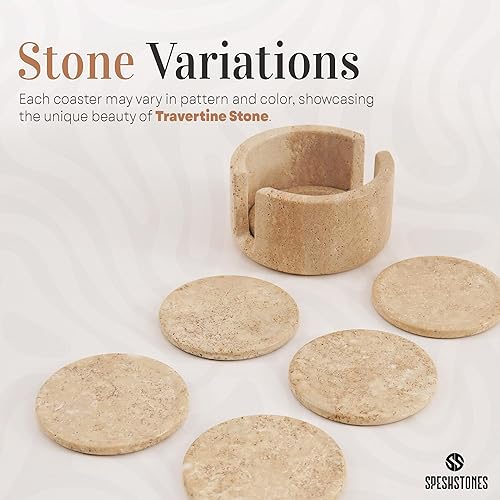 SPESHSTONES Lot de 6 Dessous de Verre Ronds avec Support de 8,9 cm Travetine Faits à la Main pour décoration de Table Basse – Dessous de Verre pour Boisson, Dessous de Verre pour Table de Cuisine et