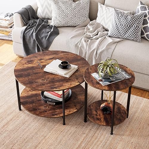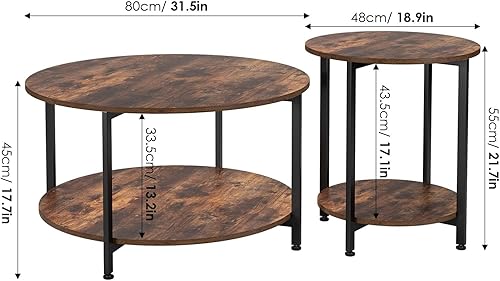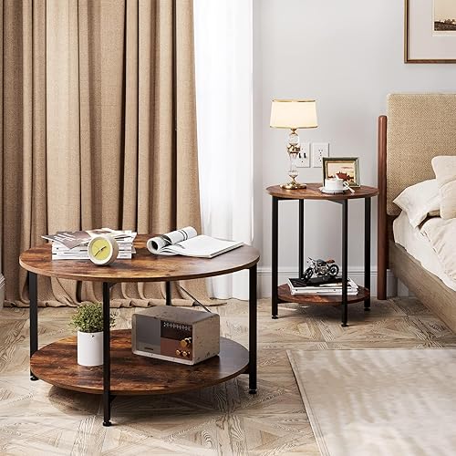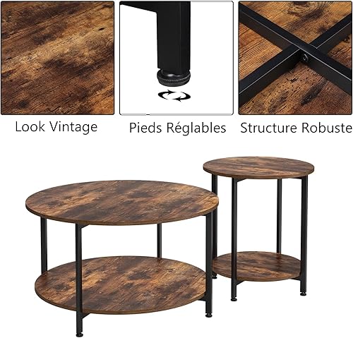 fevarbord Lot de 2 Tables Basses Rondes en Bois - pour Salon, Chambre à Coucher, Bureau - Cadre en métal Vintage - Marron et Noir