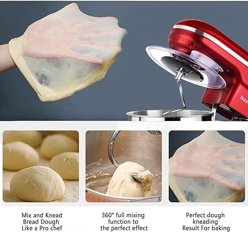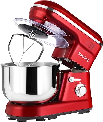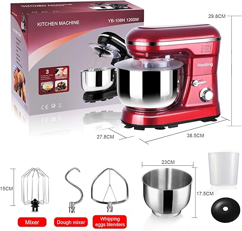 Nestling® 5L Robot Pâtissier, Faible Bruit Batteur Électrique, 3 en 1 avec Batteur, Fouet and Crochet, 5 Vitesses, avec Bol D'Acier inox Robot Multifonctionne 1200W Rouge
