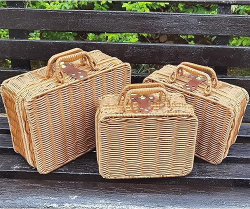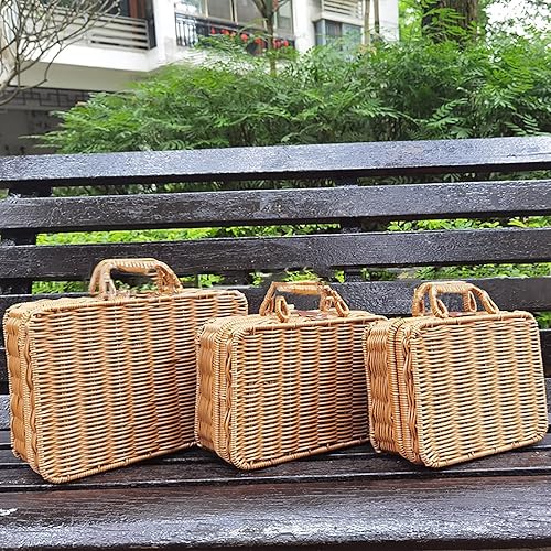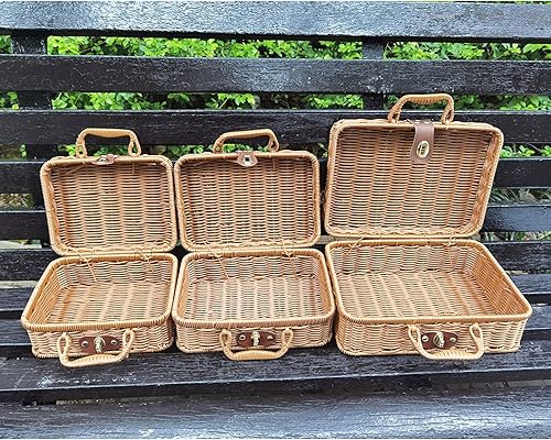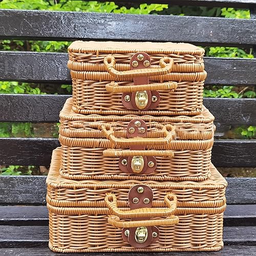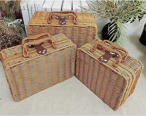 RSTYS Valise en rotin tissé, valise en osier rétro, boîte de rangement en rotin artificiel, panier de rangement tissé, poubelle de maquillage, sangle aspect cuir synthétique pour étagère