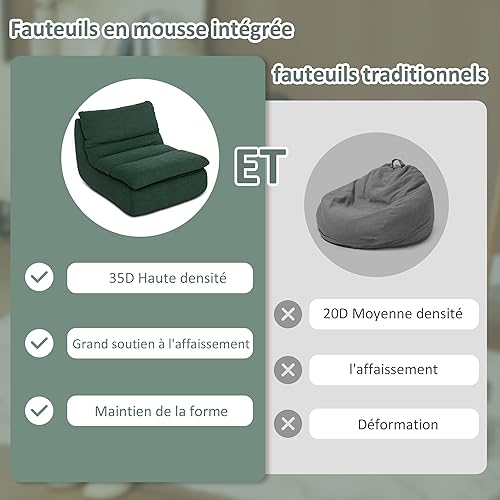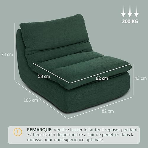 HOMCOM Canapé Paresseux chauffeuse 1 Place Fauteuil de Sol en Mousse Monobloc Ultra Haute densité, Fauteuil pour Salon, Chambre et Bureau, Charge 200 Kg, 82x103x75cm, Vert