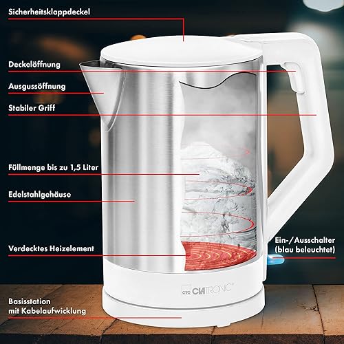 Clatronic Bouilloire, Kettle, Bouilloire 1,5 L avec arrêt automatique et manuel, connecteur rotatif à 360°, sans BPA, max. 2200Watt, Bouilloire blanche, WKS 3692