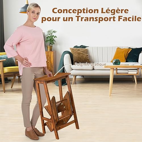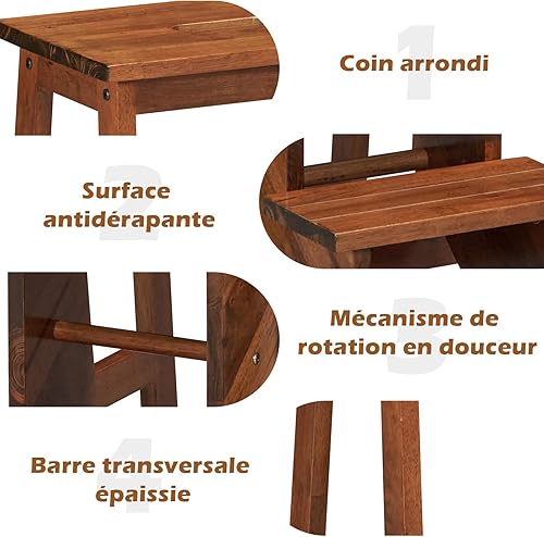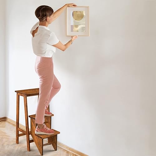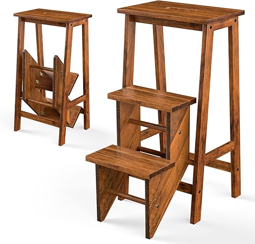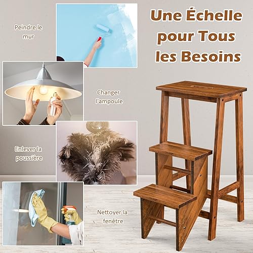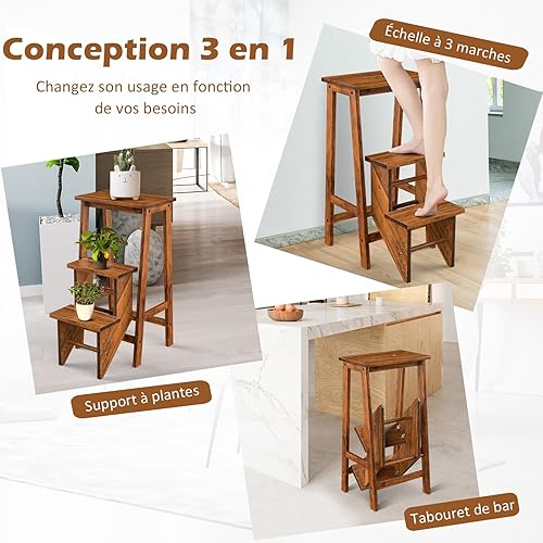 COSTWAY Tabouret Escabeau en Bois d'Hévéa Pliant, Marchepied 3 Marches, Escabeau Multifonctionnel avec Marches Réversibles, Portable, 57 X 41 X 76 cm, Capacité 310 kg (Chêne Foncé)
