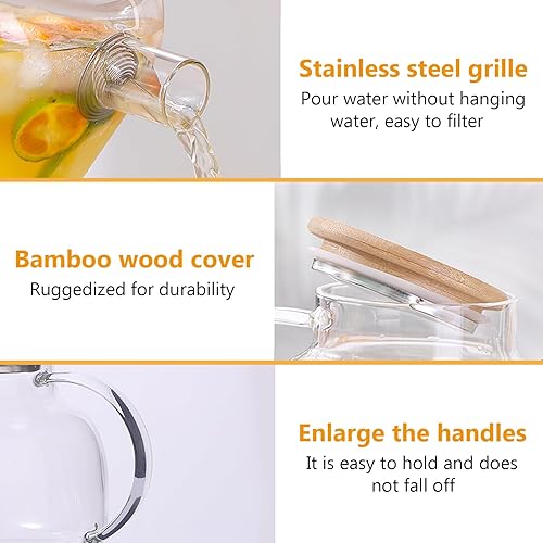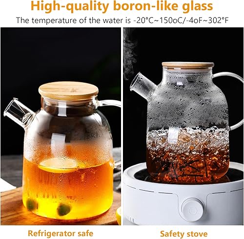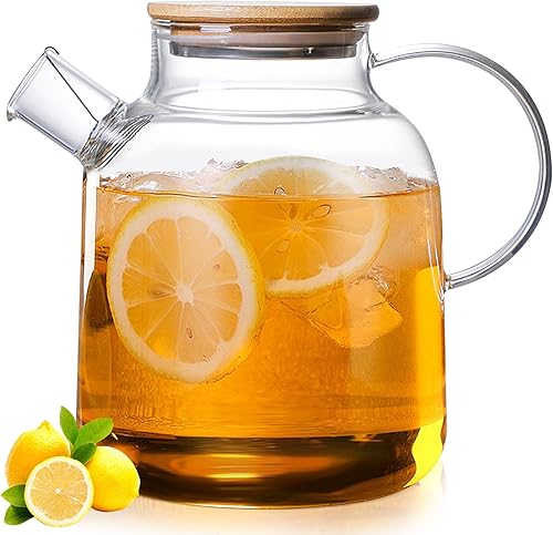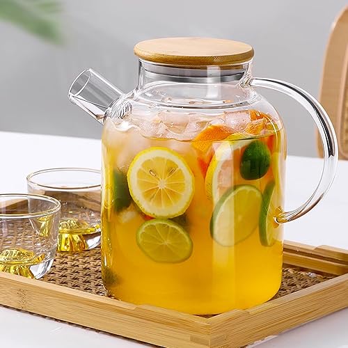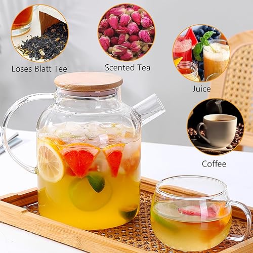 1,8 litre Théière en Verre avec Couvercle en Bambou, Filtre dans le bec Verseur Amovible, Lavable au Lave-Vaisselle, pour Boissons Chaudes et Froides