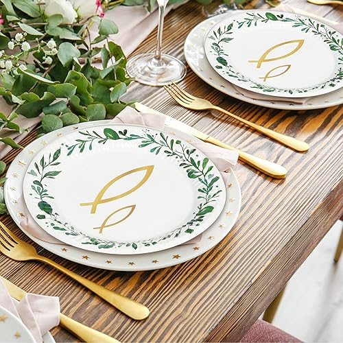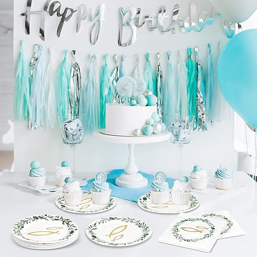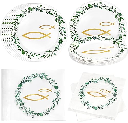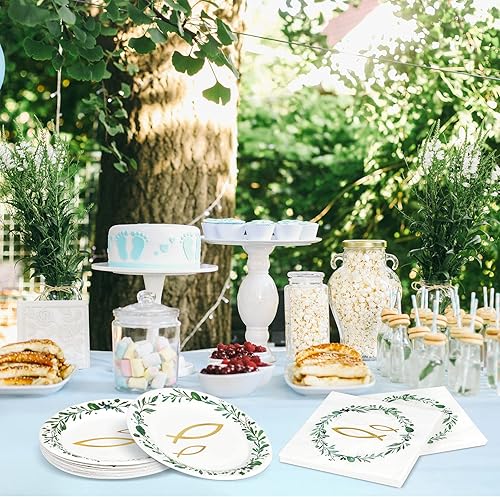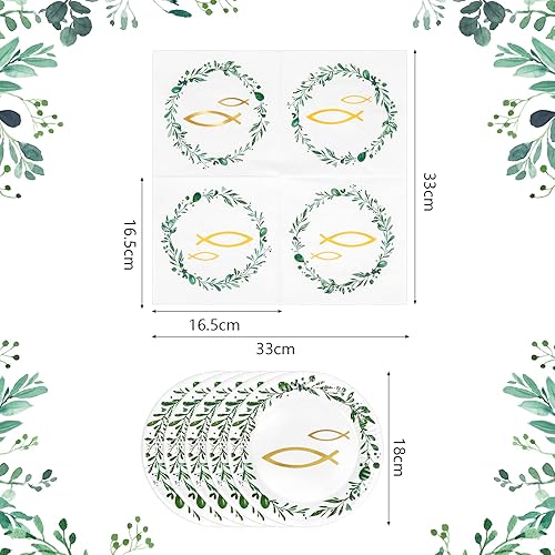 Fennoral 40 pièces serviettes table poisson dans la couronne verte serviettes table confirmation avec des assiettes en carton communion pour garçon fille baby shower anniversaire décoration table