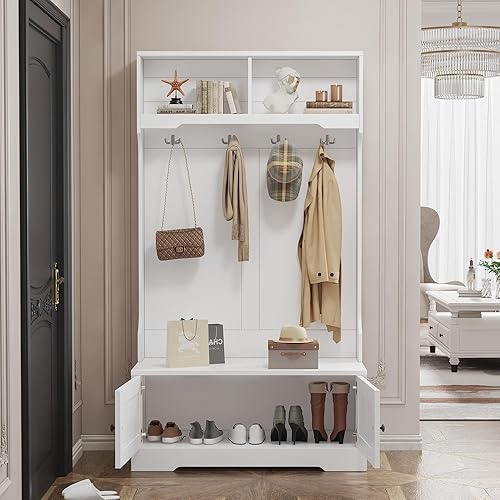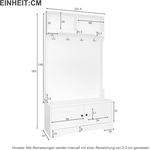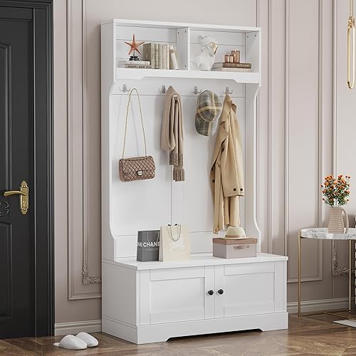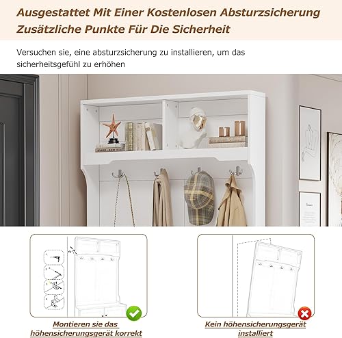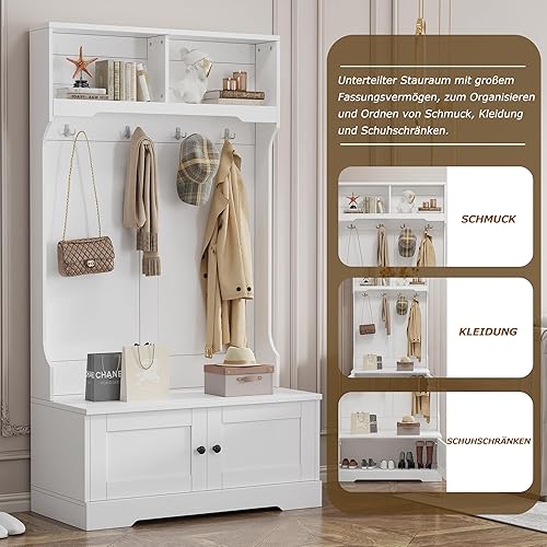 NIUAWASA Ensemble Vestiaire Blanc, Meuble d'entrée avec Espace de Rangement en Bas de l'assise avec 4 Crochets pour Accrocher et 2 Compartiments en Haut pour Un Rangement Ouvert, Porte Chaussures
