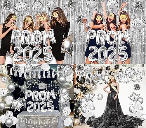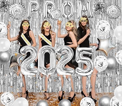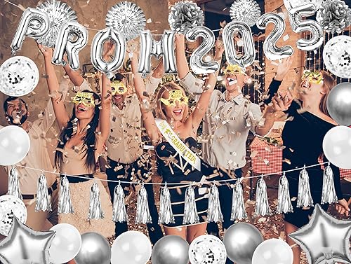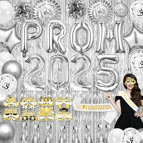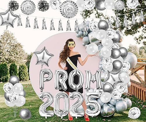 Creerluces Décorations de bal 2025 argentées - Bannière de ballons à pompons et fleurs pour remise de diplôme, lycée, remise de diplôme, classe de 2025 - Décorations de fête de nuit (multicolore)