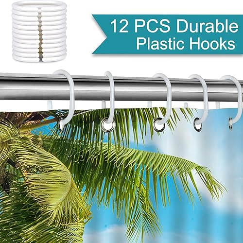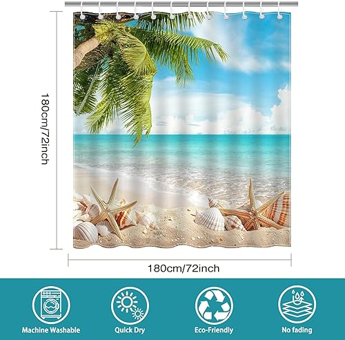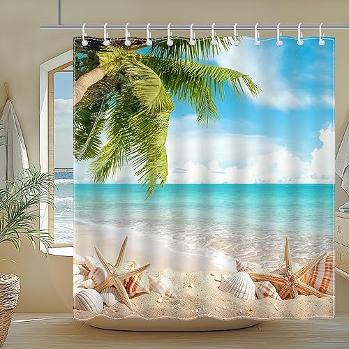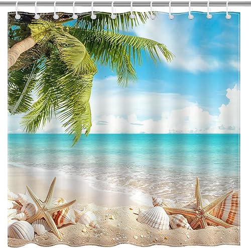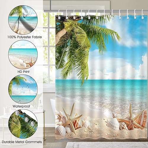 Avezano Rideau de douche en tissu imperméable avec 12 crochets, motif plage tropicale, coquillages, étoiles de mer, plage océanique, décoration de baignoire 183 x 183 cm